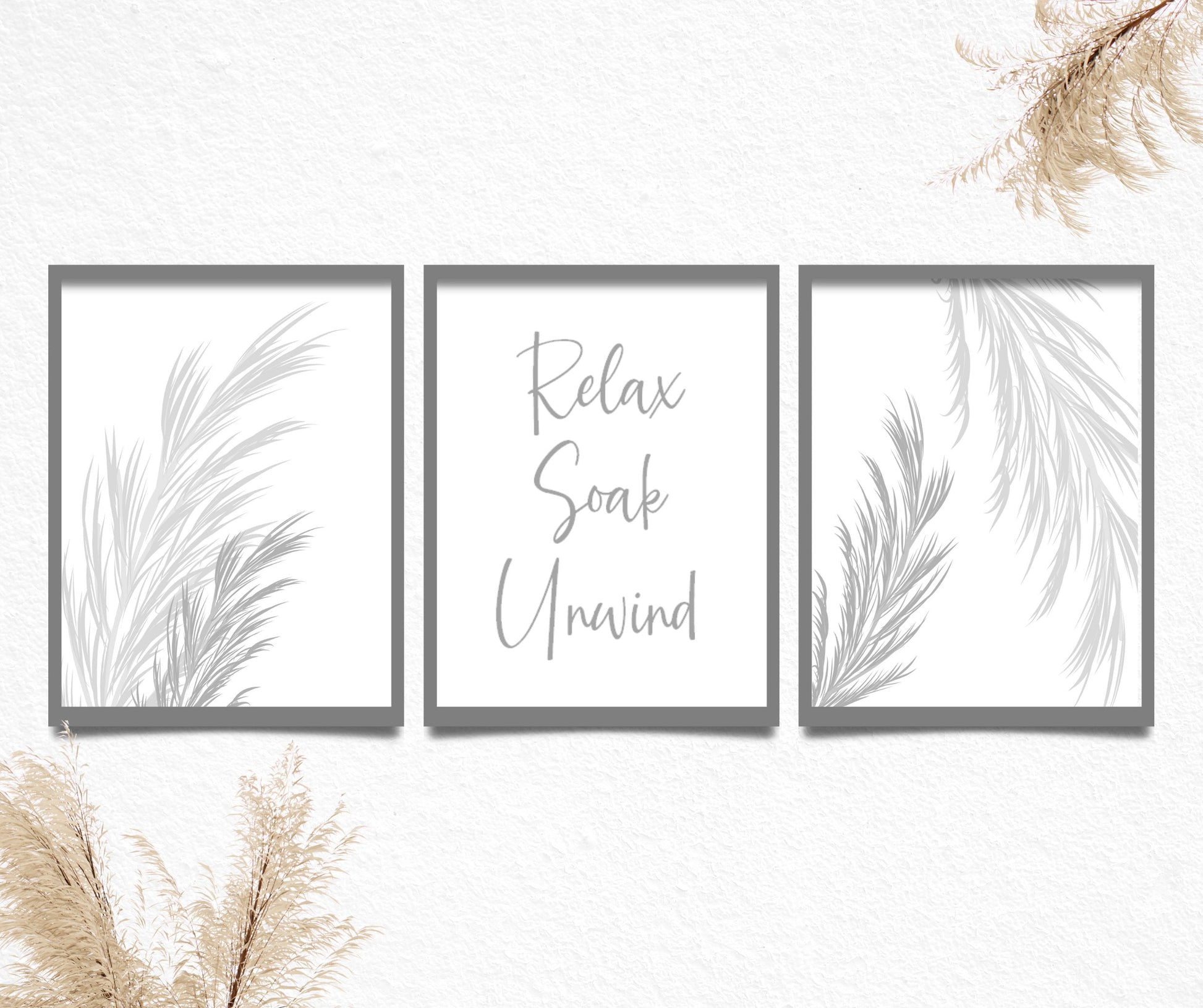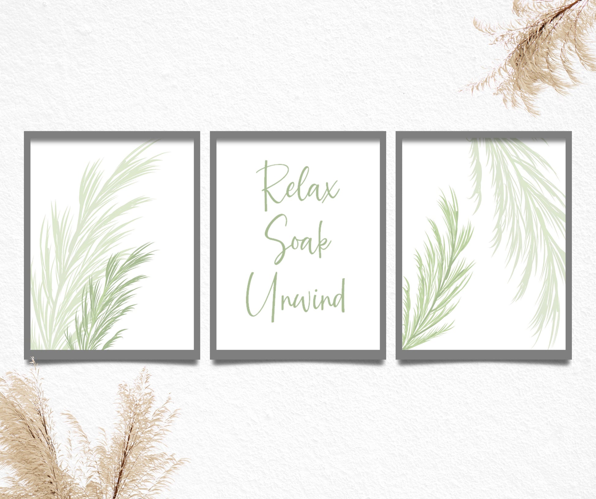 Transform your bathroom into a calming spa-inspired retreat with this set of 3 neutral botanical prints. Featuring the calming quote "Relax, Soak, Unwind," these minimalist designs are ideal for modern bathrooms, powder rooms, or guest toilets. Available in beige, grey, or sage green..