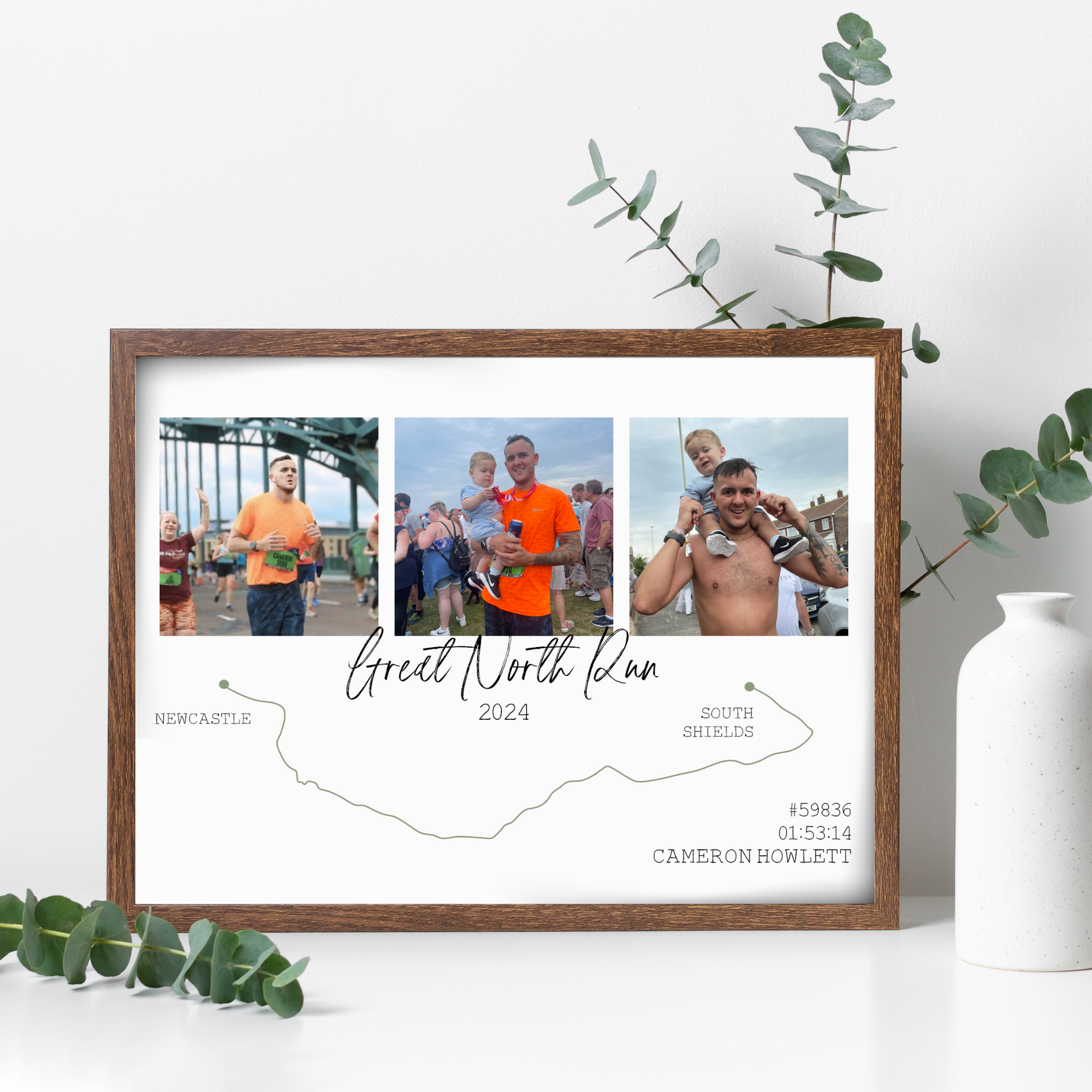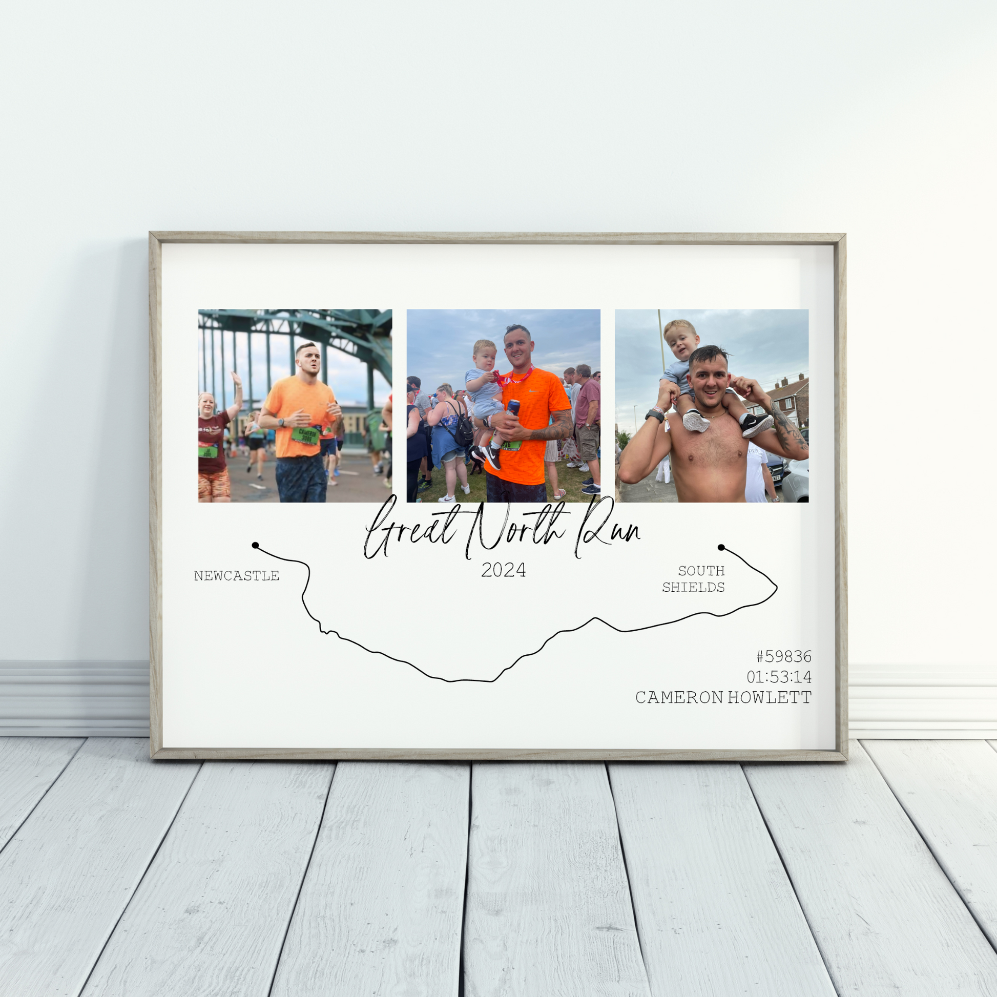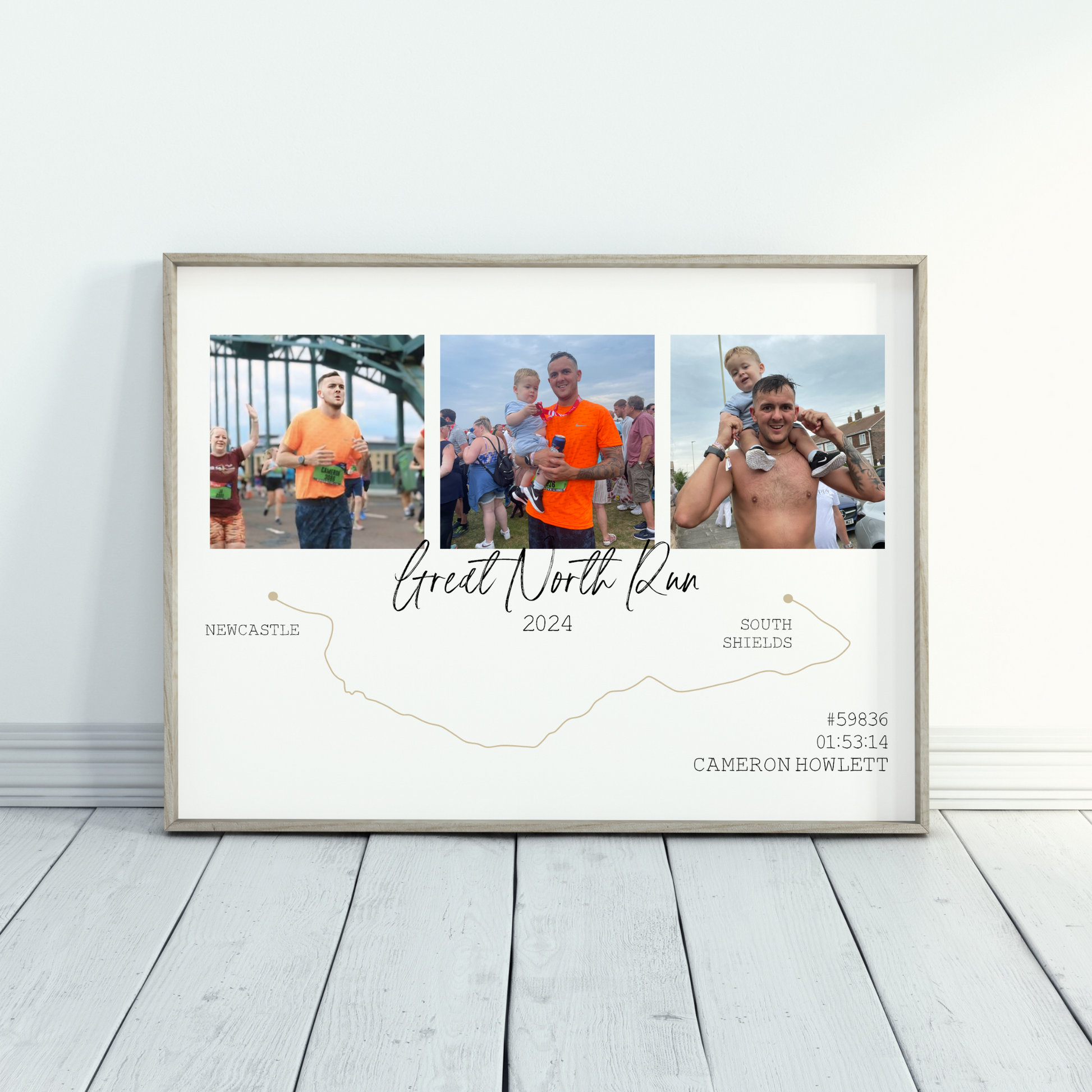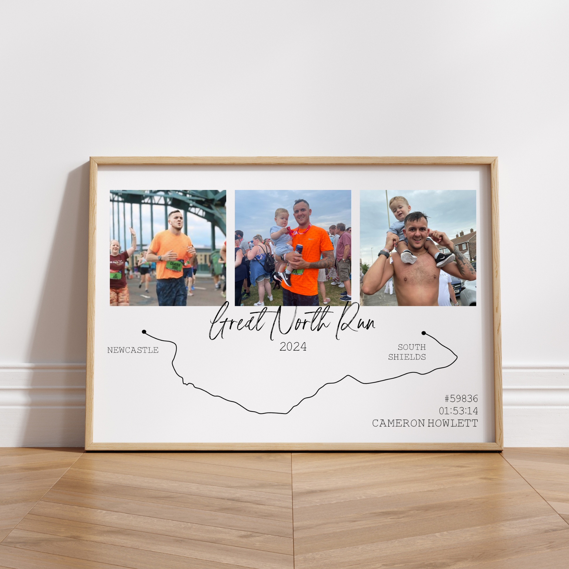 Celebrate a monumental accomplishment with our personalised Great North Run Route Print, Featuring three memorable photos from the race, a minimalist route map from Newcastle to South Shields, and personalised details like your name, race time, and bib number. Whether you ran for a PB or for fun with friends, our custom print captures the achievement of your Half Marathon experience.