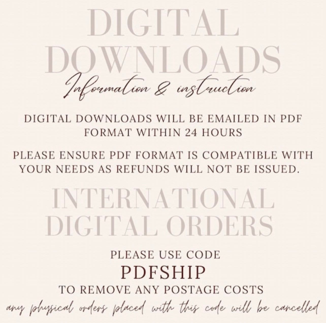 Digital Downloads will be emailed as a PDF file to the email address linked to Etsy, within 24/48 hours. Please add a different email address to the personalisation box if this is different.