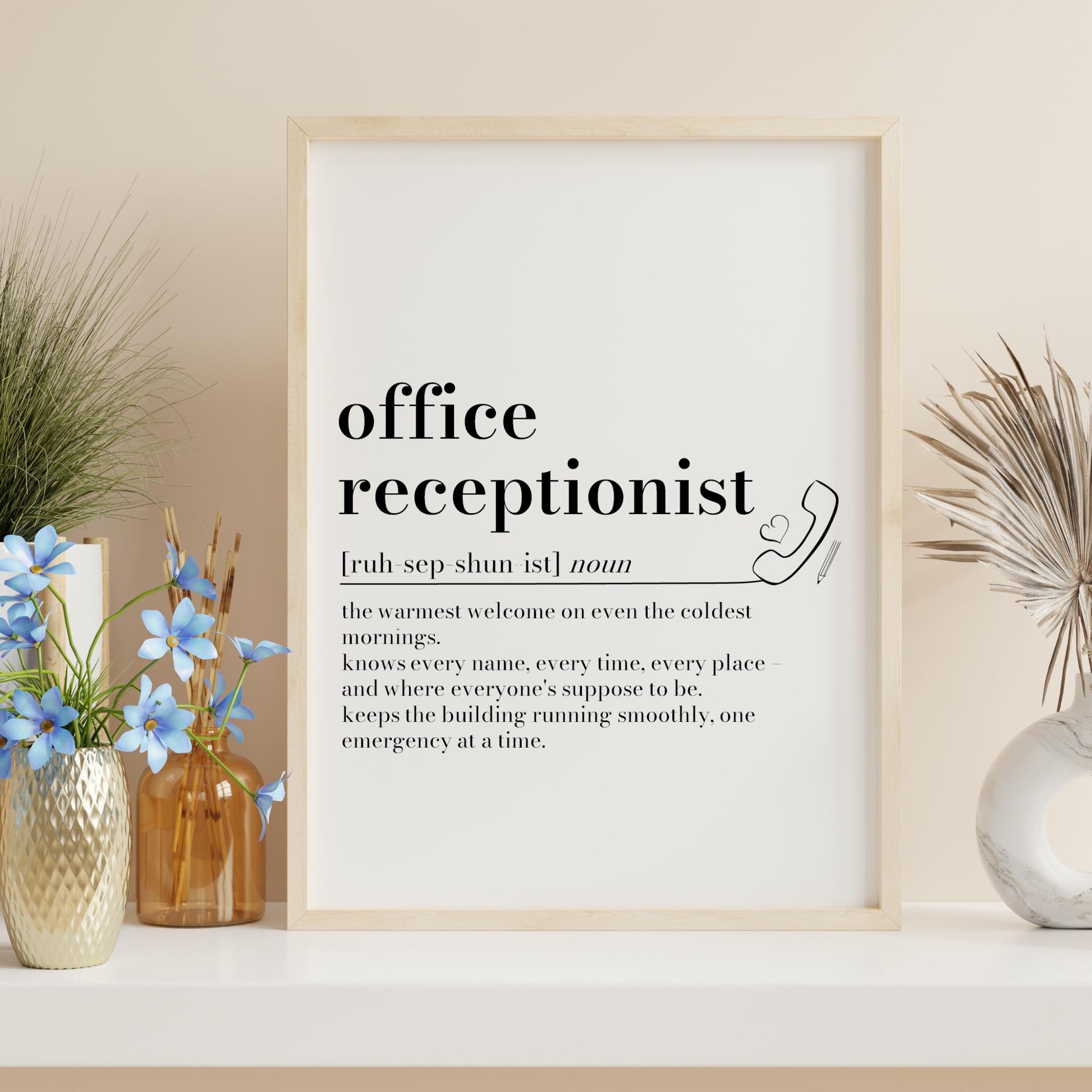 Celebrate the heart of the office with this personalised office receptionist definition print - the perfect thank you, end of term or Christmas gift. This Minimal wall art honours the calm, capable presence behind the front desk and makes a thoughtful present from parents, pupils or staff.