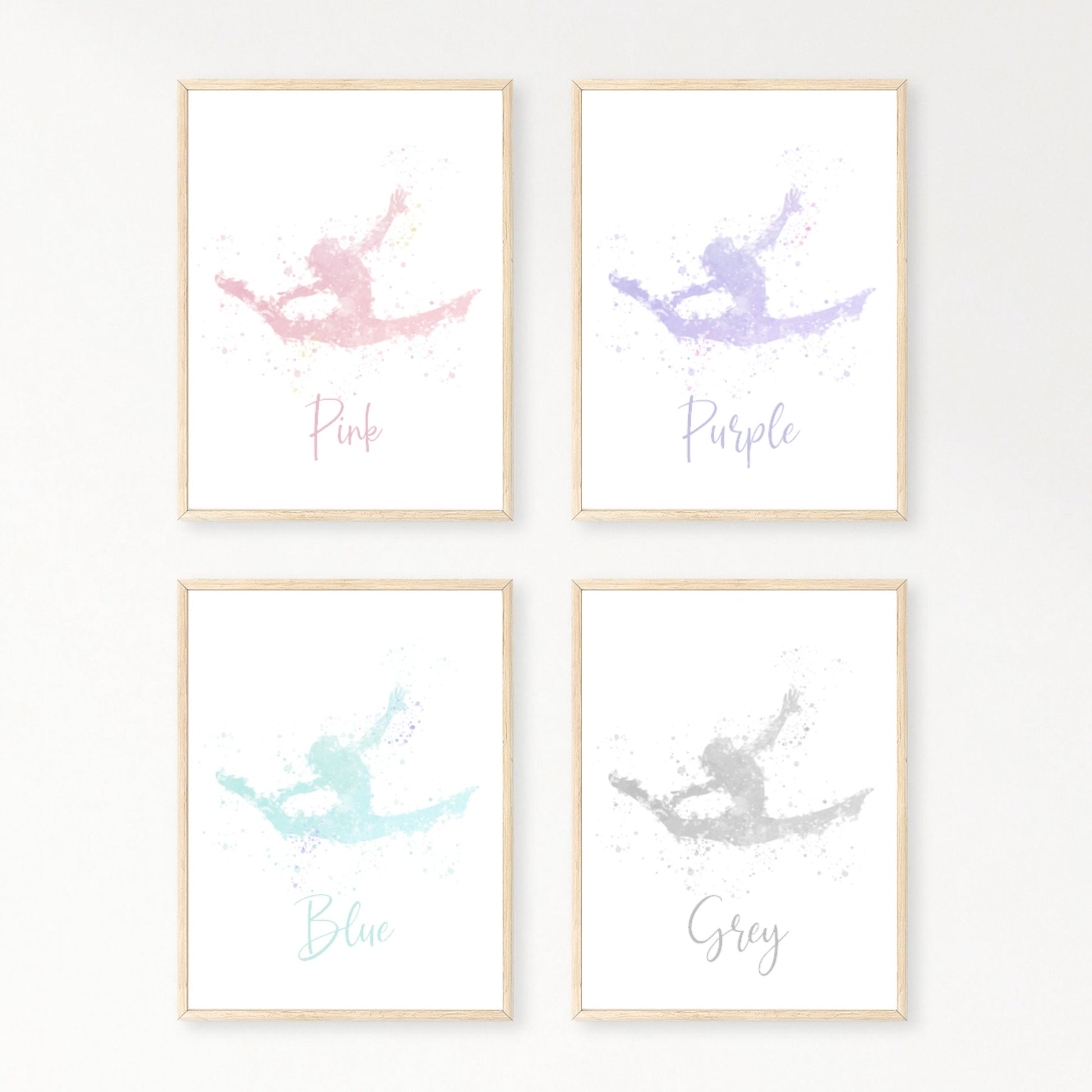 Add a splash of elegance to your space with our set of three gymnast prints. Featuring a watercolor effect and personalised with names. Available in pink, purple, blue or grey.